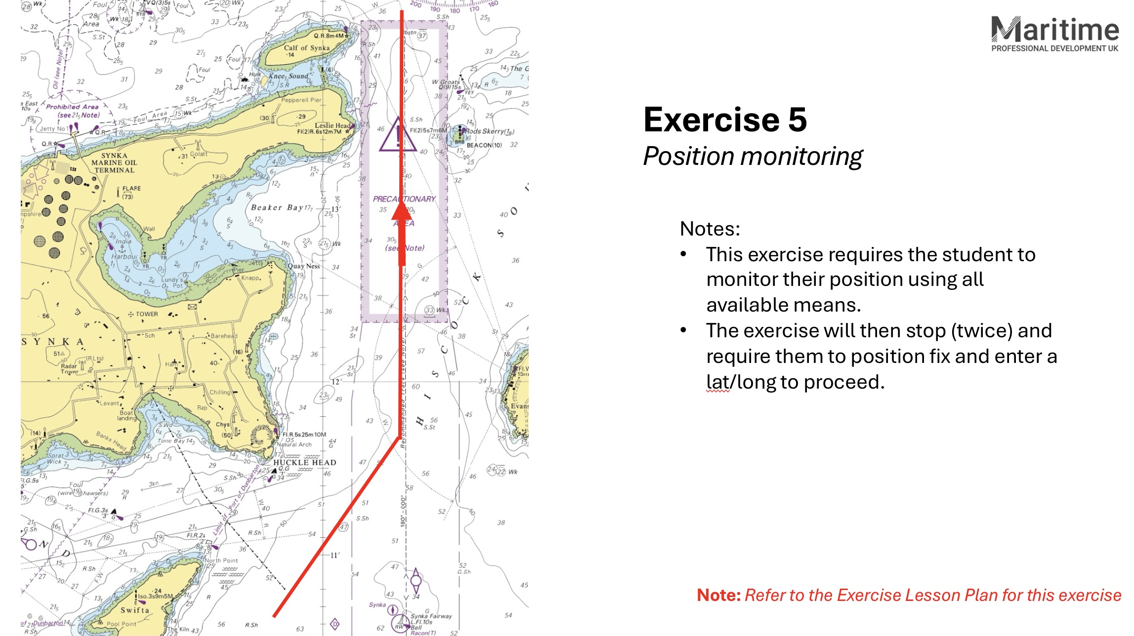 Exercise 5 - Position Monitoring stops at two points for the students to position fix and enter their latitude/longitude in order to progress the exercise. The exercise will stop in roughly the same area for all students however as the route each ...