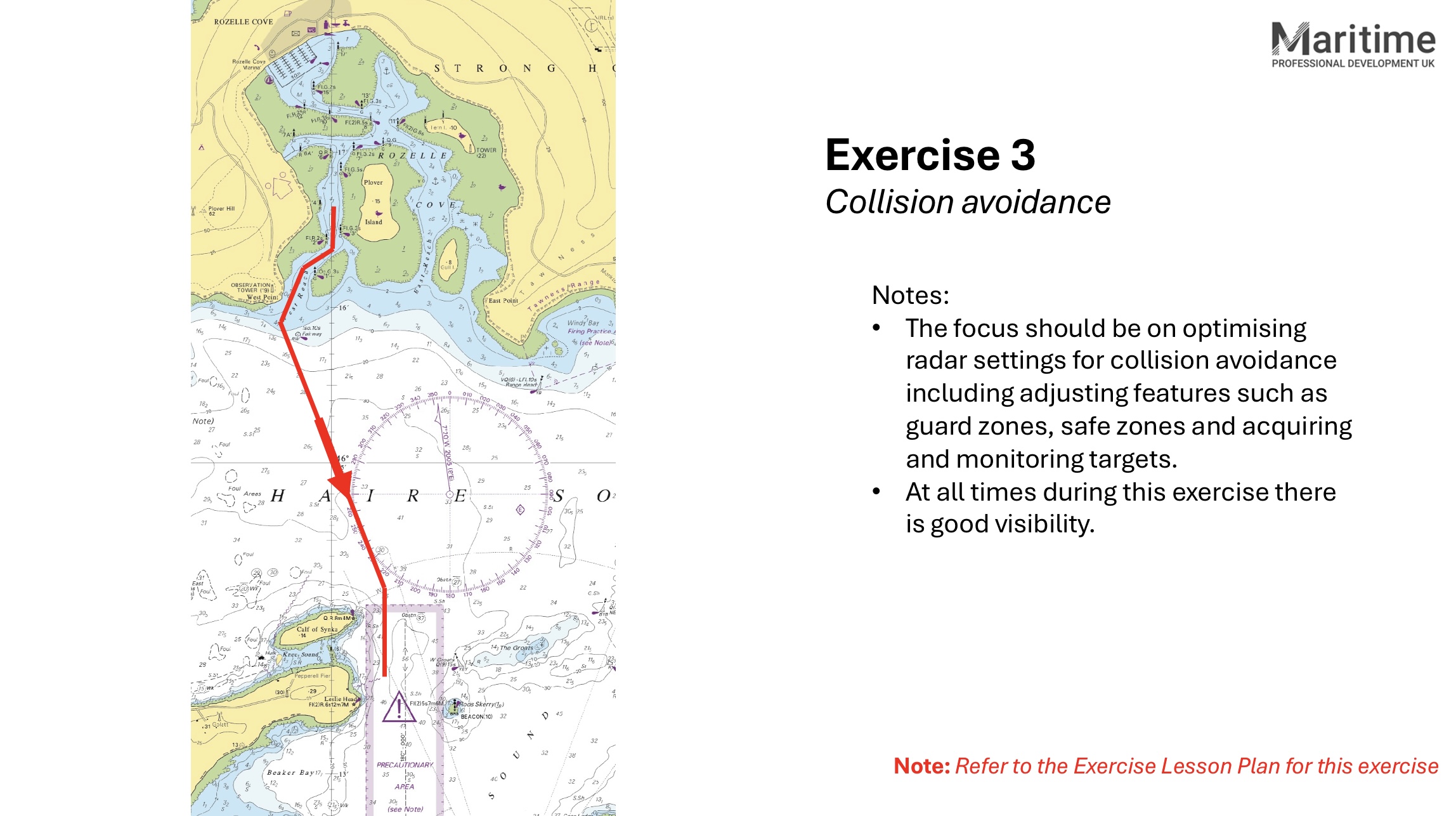 Exercise summary Student to… ‘Execute the same passage starting in the channel to the west of ‘Plover Island’ to ‘Leslie Head’. However, during this passage the visibility will markedly deteriorate. As visibility reduces you will need to use the ...
