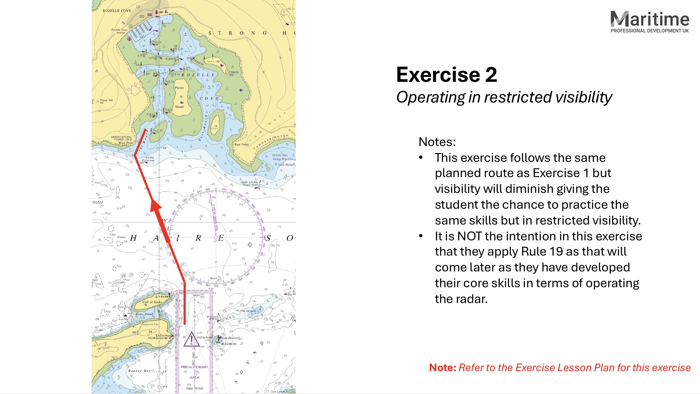 Exercise summary Student to… ‘Execute the same passage starting in the channel to the west of ‘Plover Island’ to ‘Leslie Head’. However, during this passage the visibility will markedly deteriorate. As visibility reduces you will need to use the ...