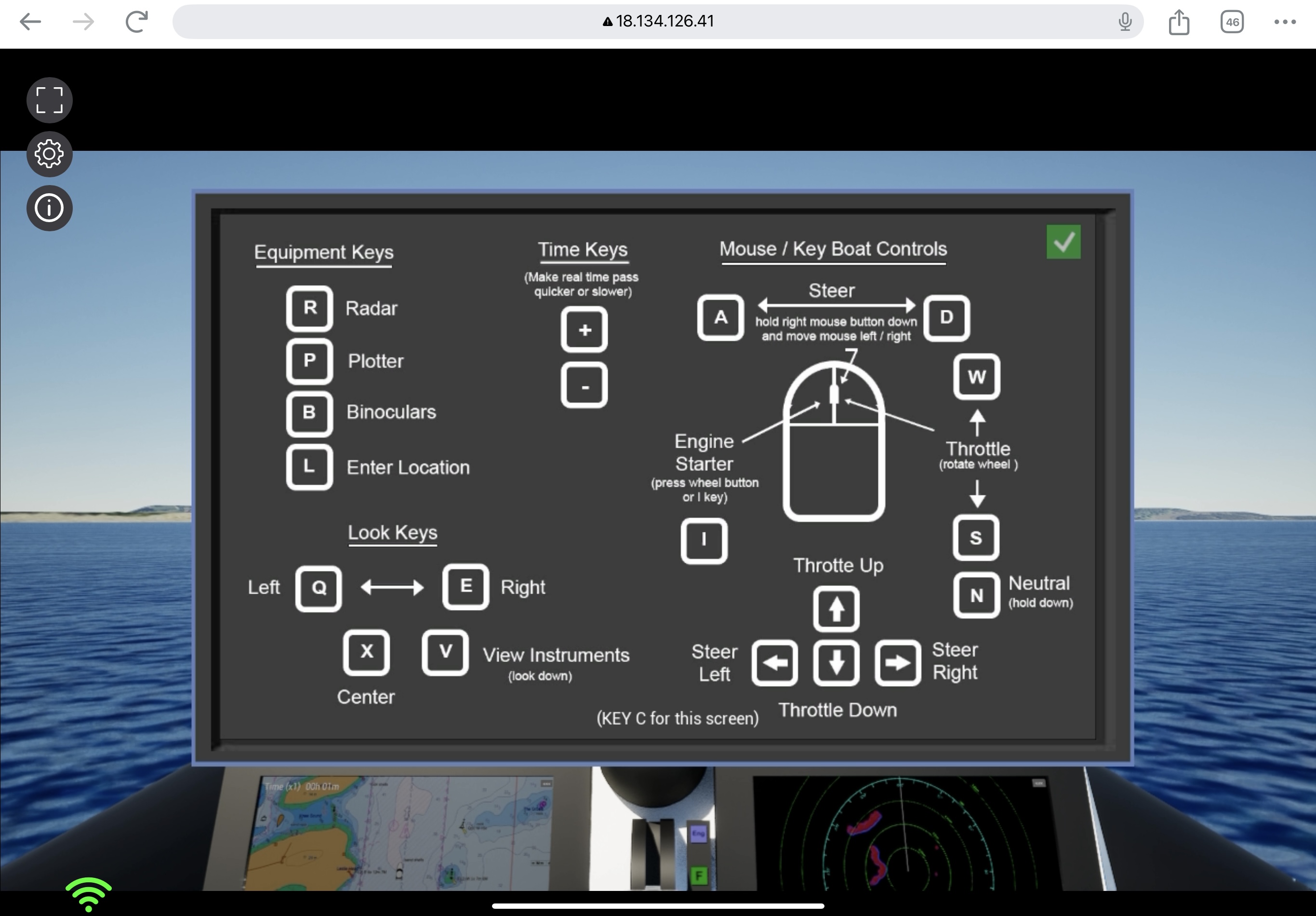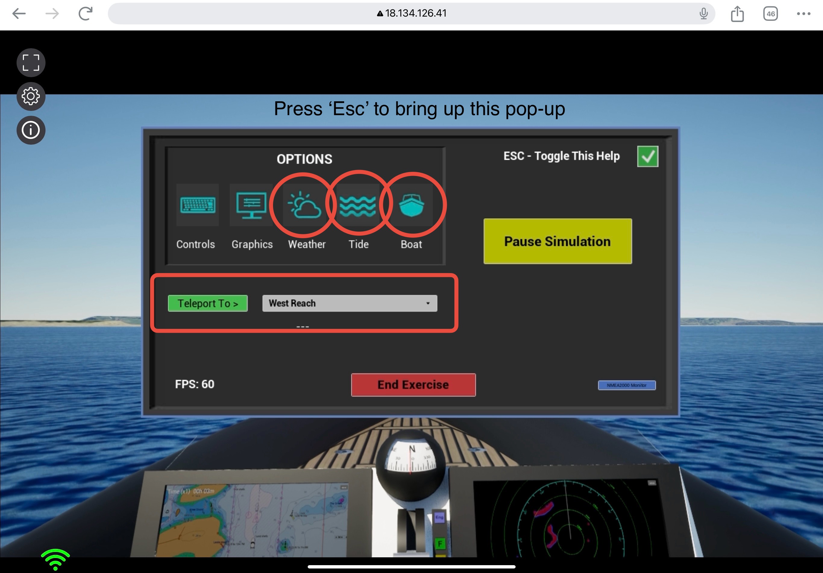 - If you select ‘Explore Map’ this will take you straight to the vessel view. From this screen you can operate the vessel and adjust settings to create bespoke exercises. You can ‘Teleport’ to various locations around the ‘RYA Training Chart 4 world’.