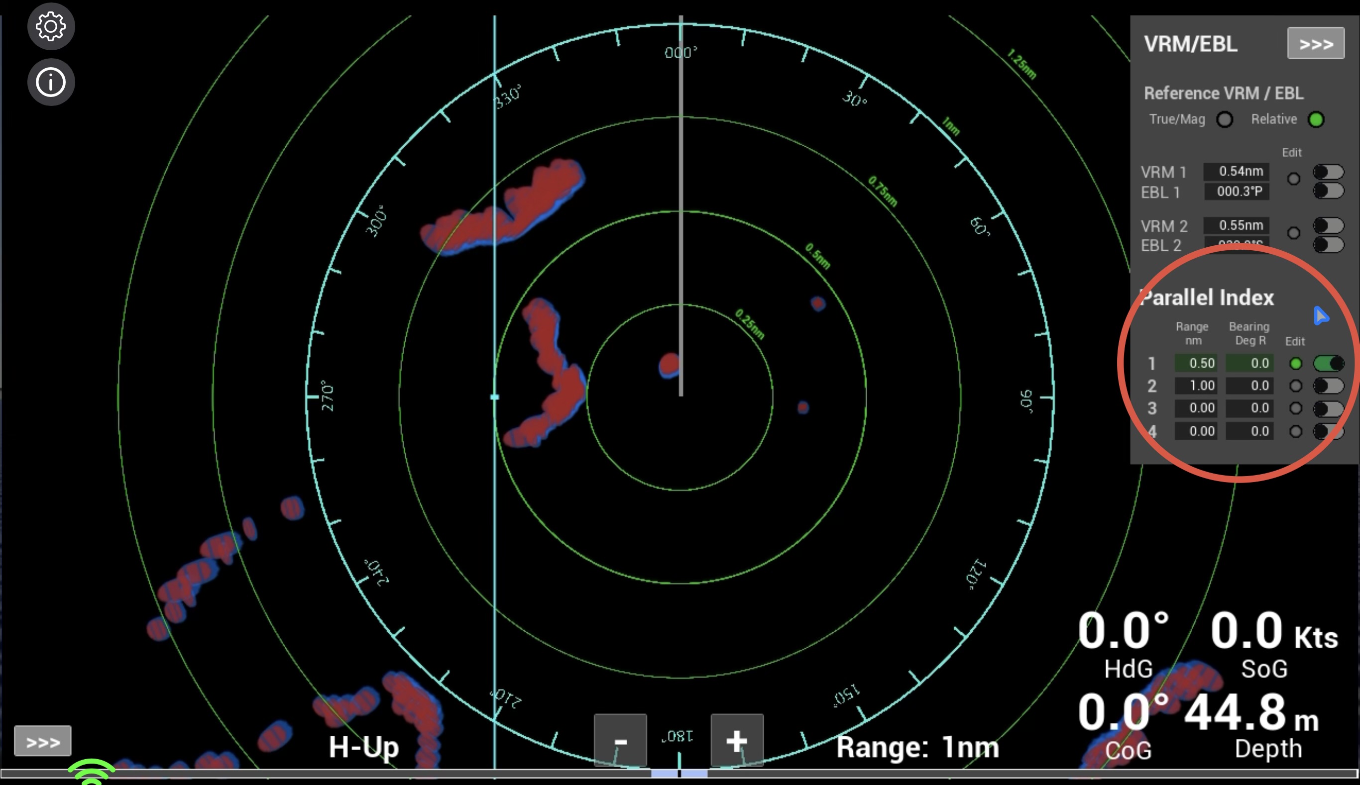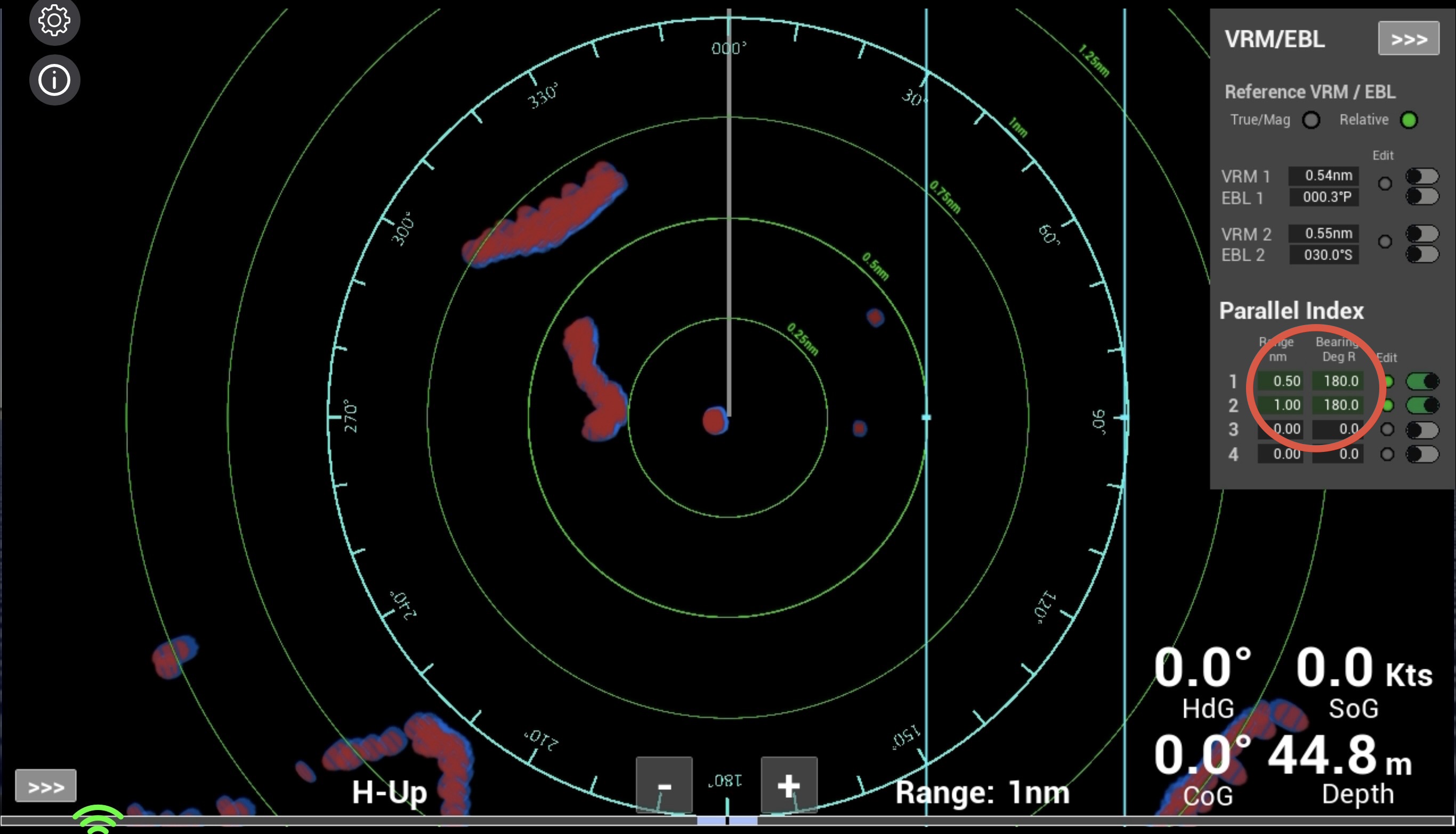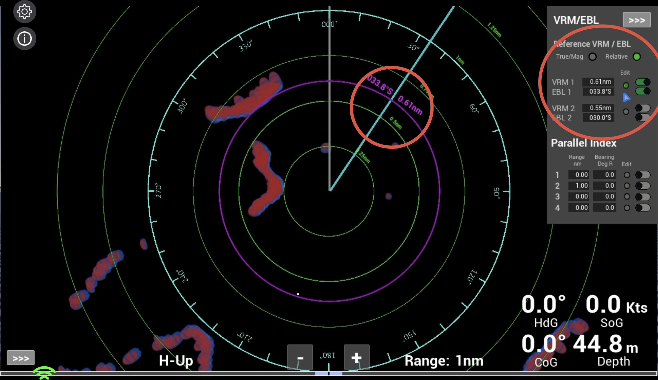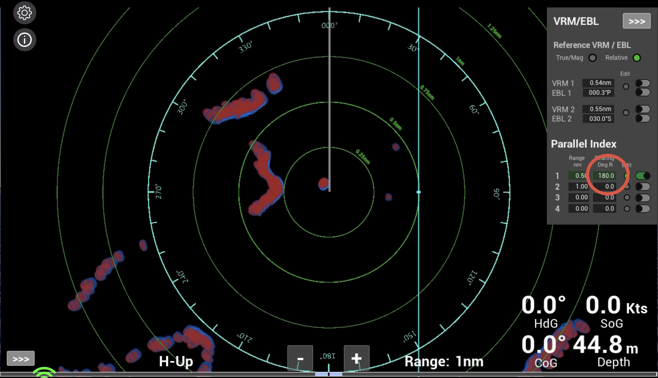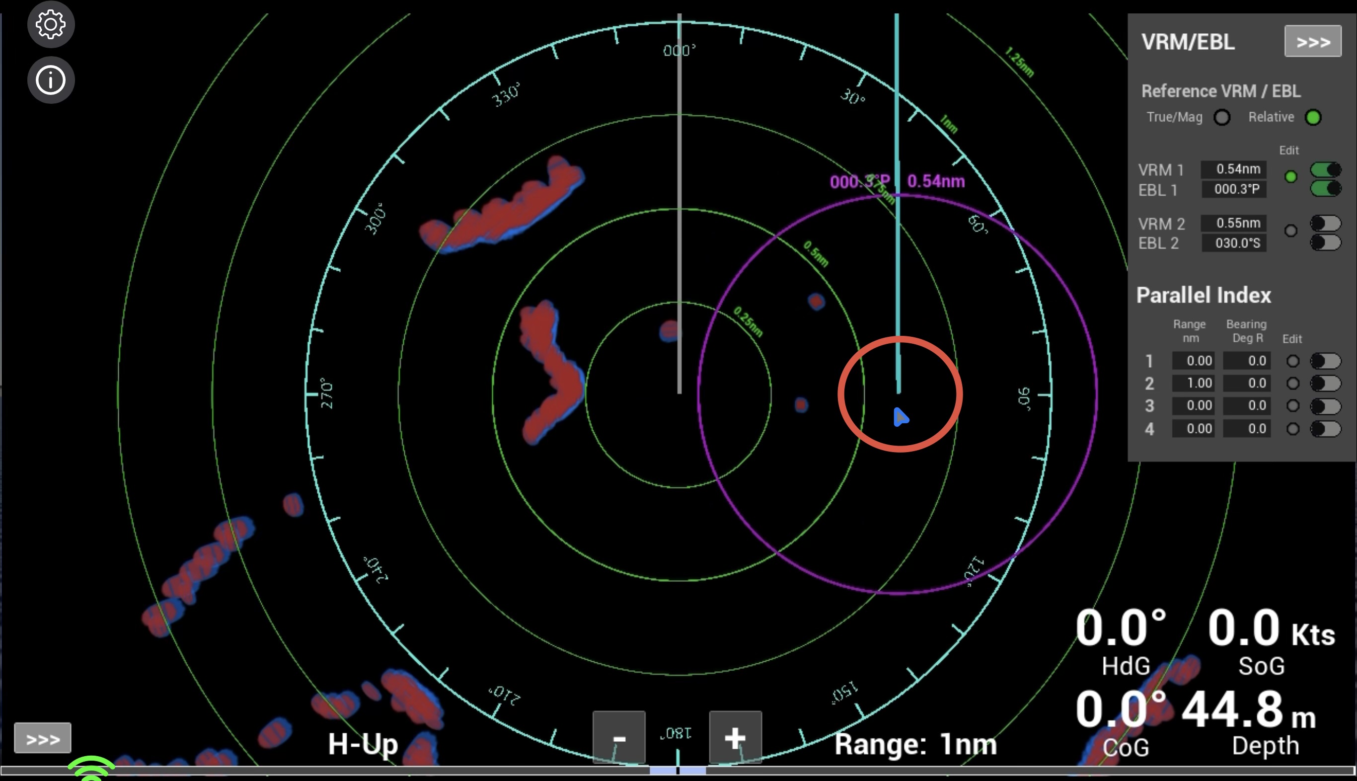 Note: The way that VRMs and EBLs are adjusted in the simulator reflects the way that they are typically adjusted in Raymarine and Garmin type units. Such units do not though use parallel index lines. The functionality of PIs is based on the methods used in units such as Furuno.